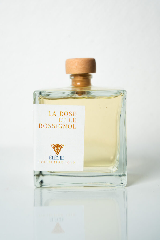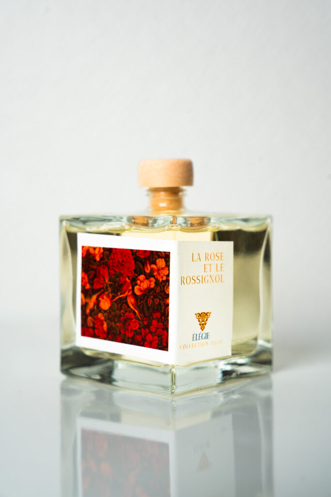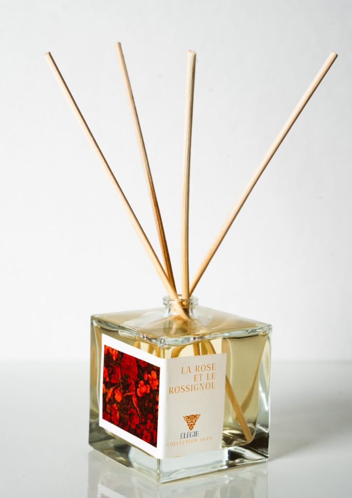 Emblème de la culture persane, le motif Gul-o-Bulbul (la rose et le rossignol) unit l’aimé et l’amant dans une quête spirituelle ou terrestre. Sous la dynastie Qâdjâr, cette imagerie poétique s’est étendue de la littérature aux arts décoratifs grâce à la technique du papier mâché peint et laqué alors fleurissante. Ce symbole d’identité nationale apparaît tant dans la grande épopée du Shahnameh que dans les Ôdes du poète Hâfiz. La Maison Elégie vous invite à redécouvrir cette poésie en l’associant à une essence de pétales de rose orientale qui vous plongera dans la fraîcheur d’un jardin oriental.