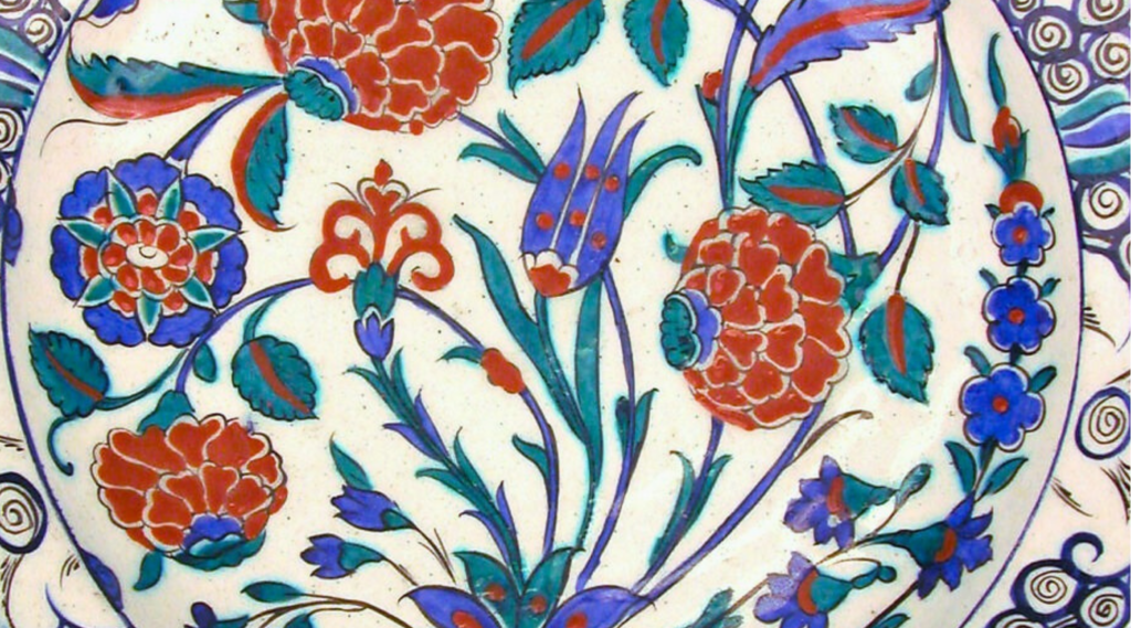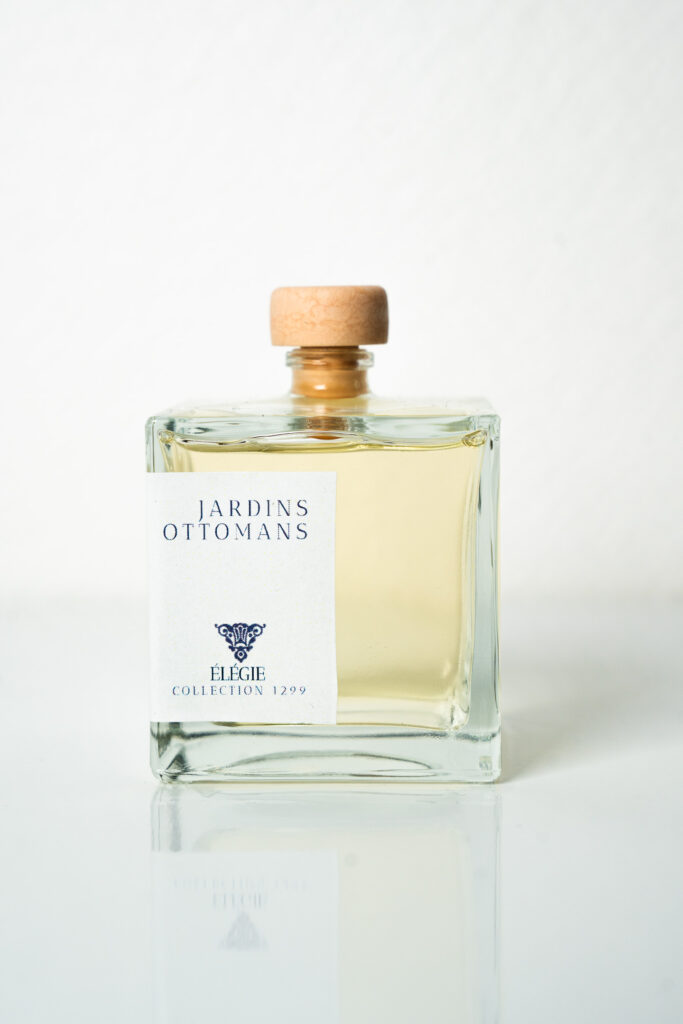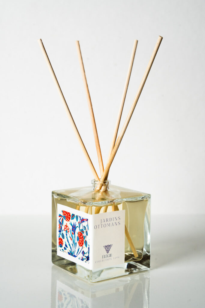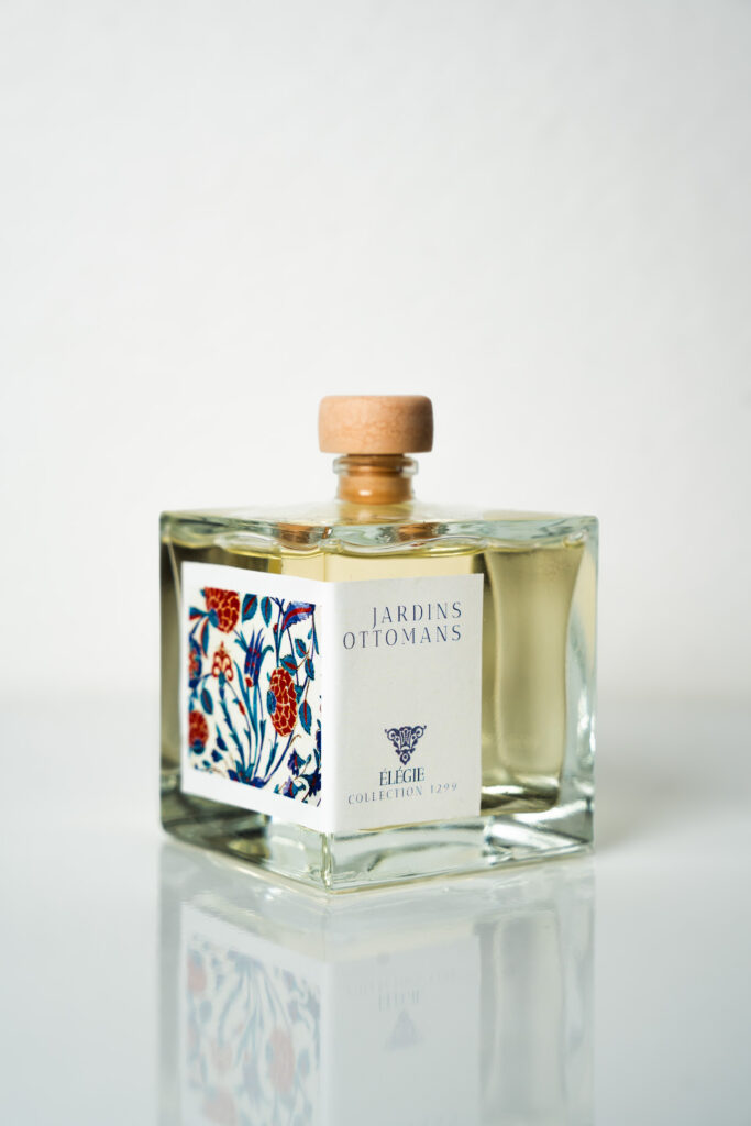 Catégorisé comme le troisième grand style ottoman, le style floral et naturaliste est né du goût pour l’horticulture et de la diffusion des arts du livre. Le motif présente un entremêlement d’espèces végétales reconnaissables, telles que les tulipes et les iris. Cette luxuriante composition peut faire écho au manuscrit Kalila et Dimna, recueil de fables largement diffusé entre l’Inde, le Moyen-Orient et le monde ottoman. Si l’œuvre révèle des influences multiples (mameloukes, safavides et indiennes), elle intègre également des éléments ottomans reconnaissables. La Maison ELEGIE rend hommage à ces motifs fabuleux en les accompagnant d’une fragrance lumineuse de fleur d’oranger et de musc blanc, évoquant un jardin en fleurs, délicat et enveloppant.